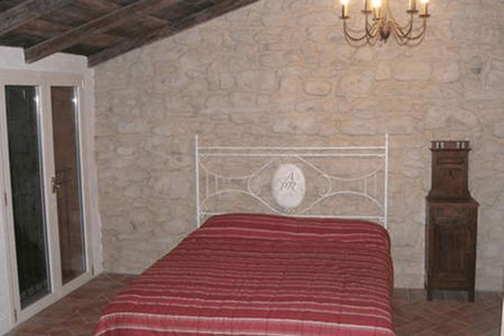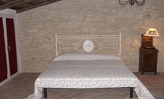 Ampio monolocale di 30 mq con un letto matrimoniale in ferro battuto e un divano letto matrimoniale, mura in sasso e soffitto con travi in legno dotato di bagno privato en suite con doccia e servizi.
